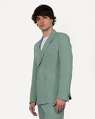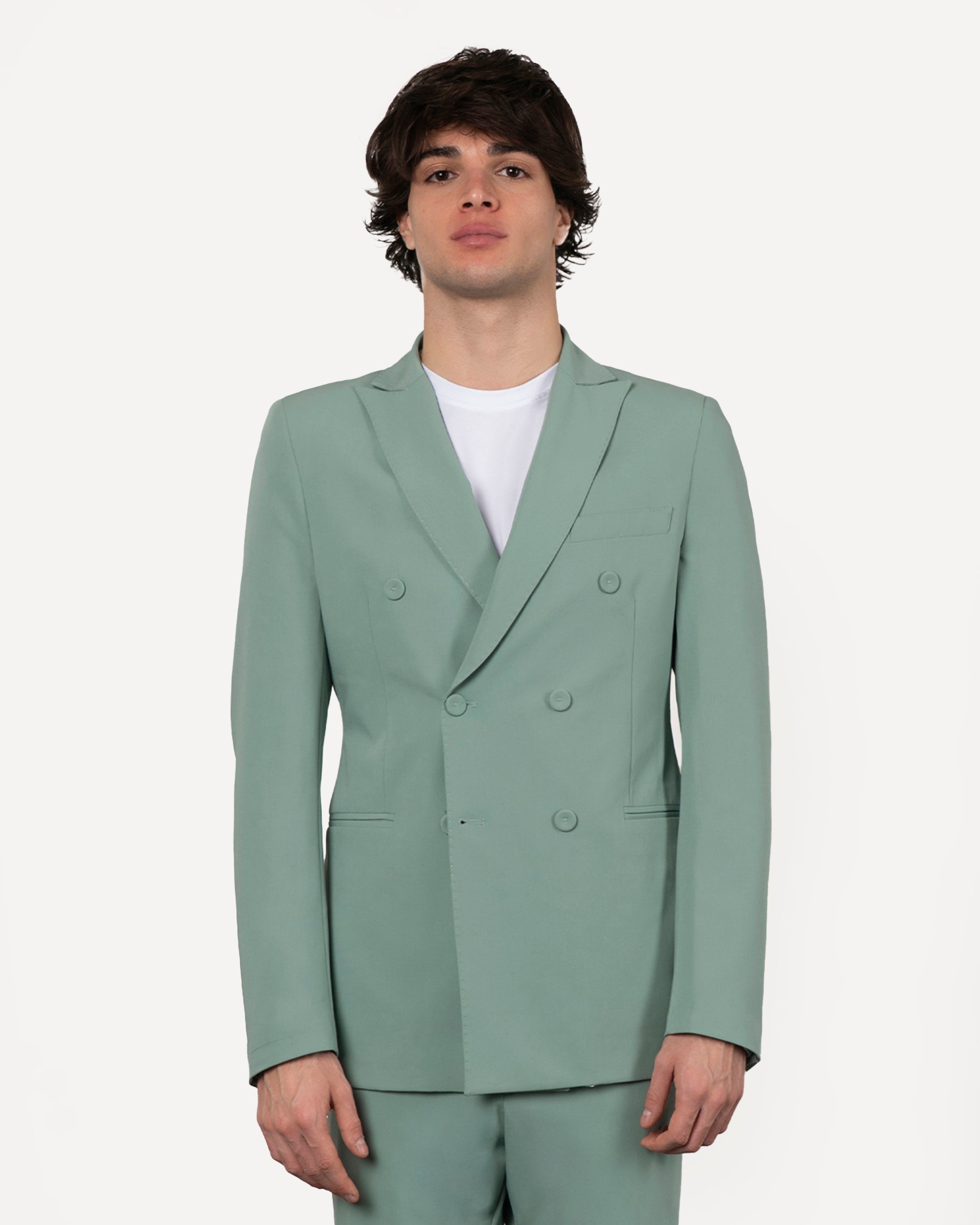 L'abito doppio petto con bottoni in tessuto tinta su tinta offre un look elegante e sofisticato, con una chiusura a doppio bottone che dona struttura alla silhouette. Il pantalone, dotato di risvolto sartoriale, aggiunge un tocco di classe. La vestibilità è regular, ma tende allo slim, per una linea moderna e definita. Un equilibrio perfetto tra stile raffinato e comfort.