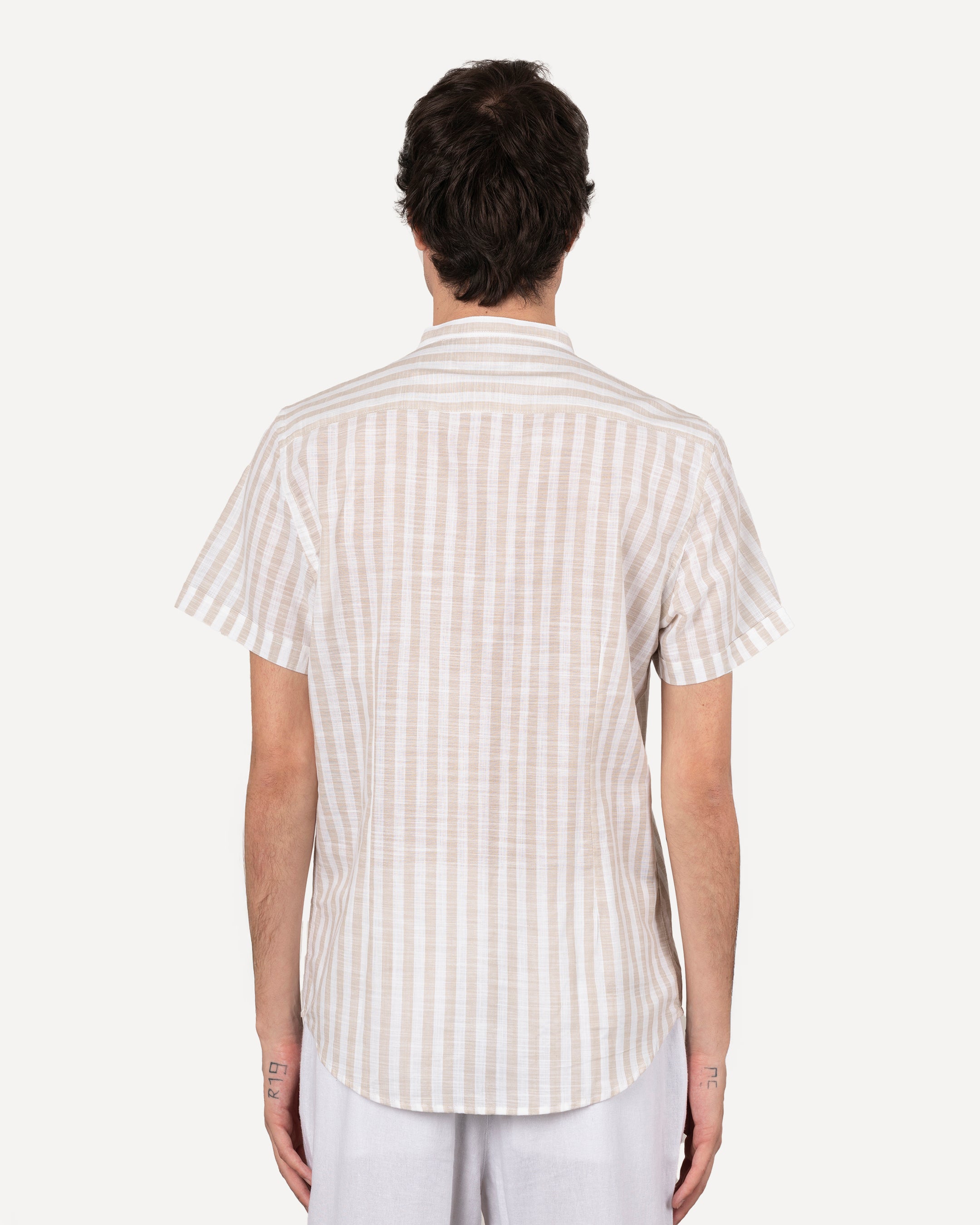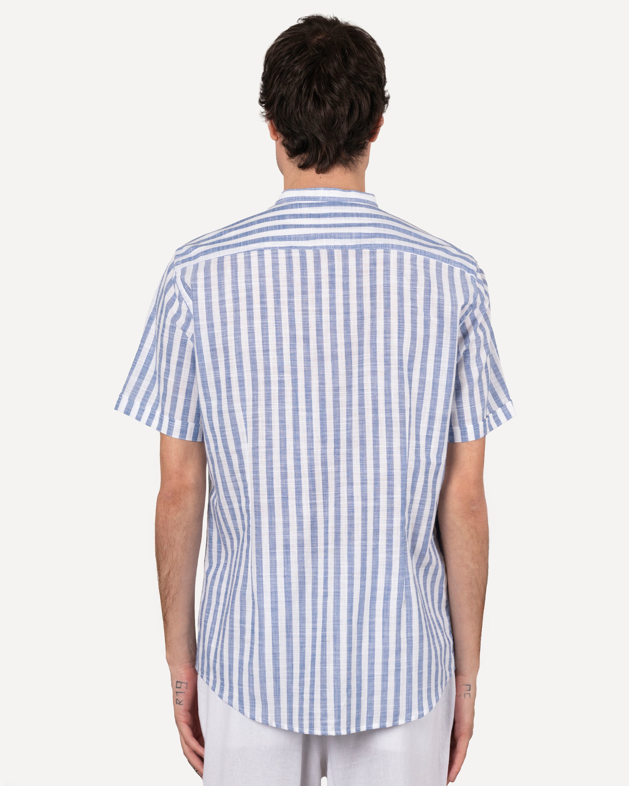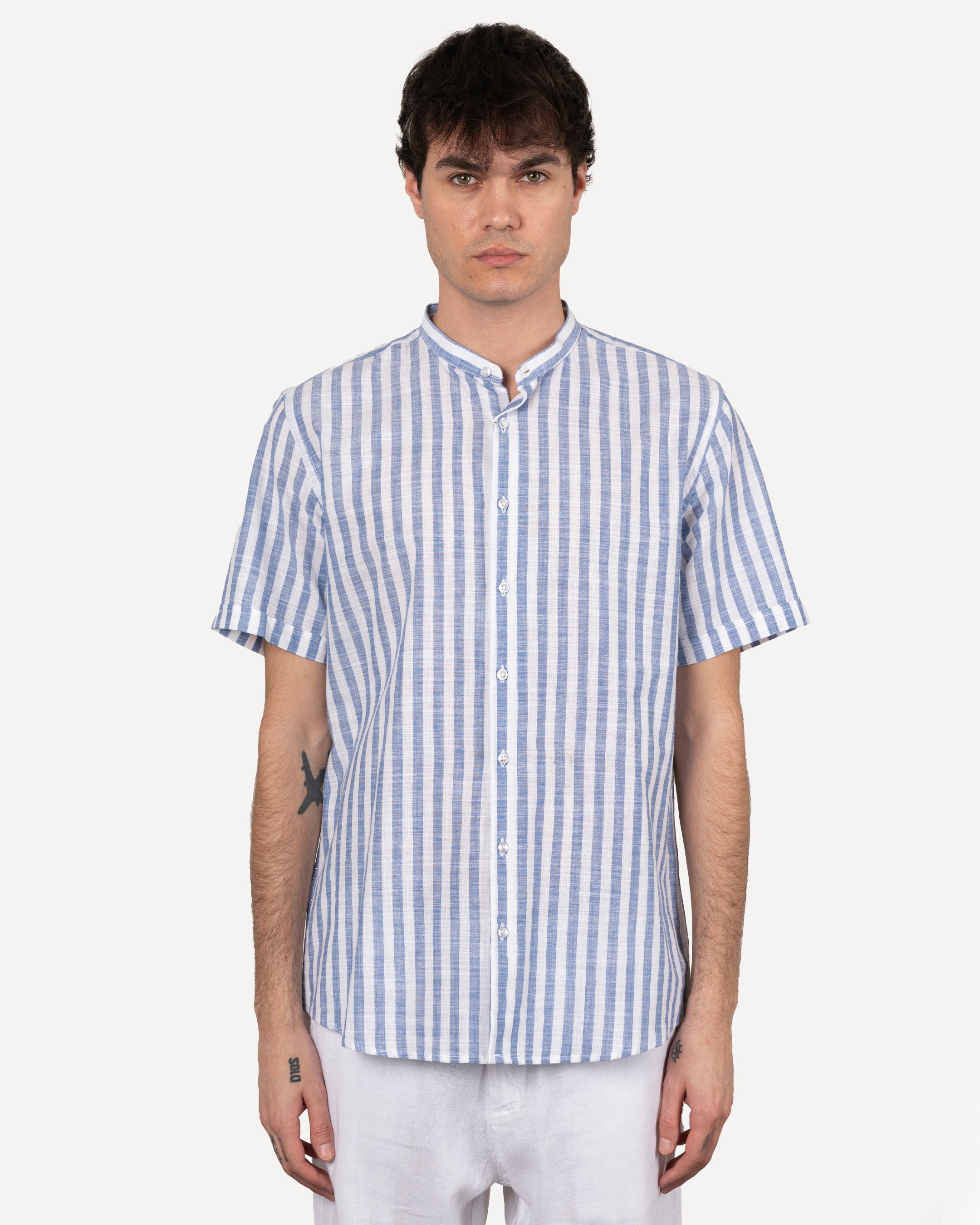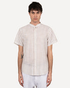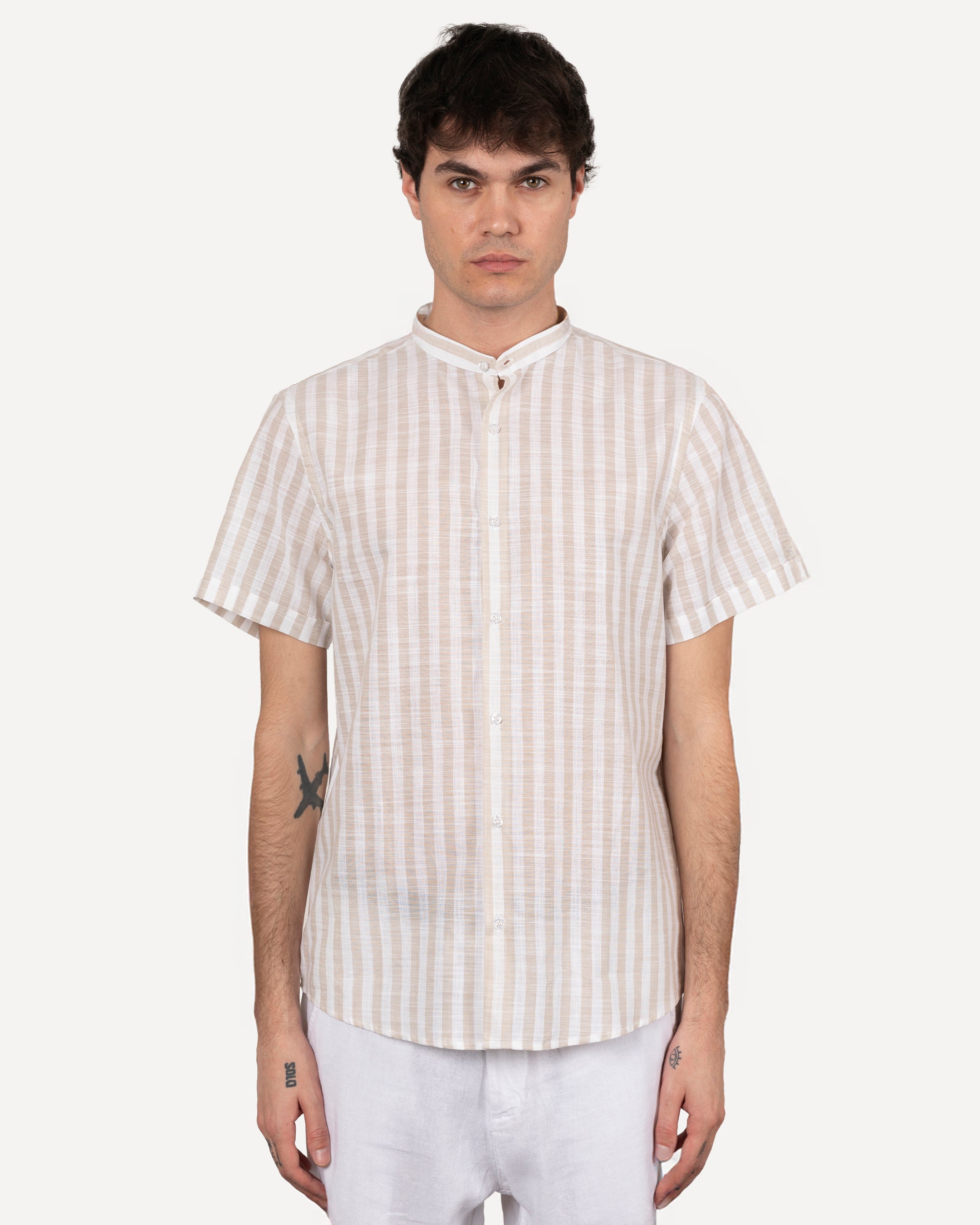 Camicia in lino a mezza manica con collo Koreano, essenziale e contemporanea. Le righe di ampiezza media donano dinamismo al design, perfetta per un look raffinato ma informale. Leggera, traspirante e ideale per le giornate più calde.