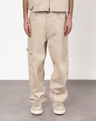 Pantalone carpenter comfort fit in bull, perfetto per un look funzionale e contemporaneo. Caratterizzato da tasche utility e loop porta martello, unisce praticità e stile. La vestibilità comoda assicura libertà di movimento, mentre il tessuto resistente garantisce durata. Ideale da abbinare al gilet coordinato per un outfit dal carattere deciso.